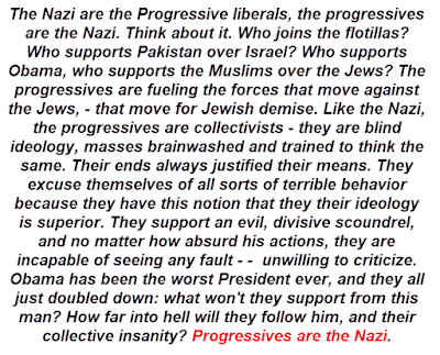 The Nazi are the Progressive liberals, the progressives are the Nazi. Think about it. Who joins the flotillas? Who supports Pakistan over Israel? Who supports Obama, who supports the Muslims over the Jews? The progressives are fueling the forces that move against the Jews, - that move for Jewish demise. Like the Nazi, the progressives are collectivists - they are blind ideology, masses brainwashed and trained to think the same. Their ends always justified their means. They excuse themselves of all sorts of terrible behavior because they have this notion that they their ideology is superior. They support an evil, divisive scoundrel, and no matter how absurd his actions, they are incapable of seeing any fault - - unwilling to criticize. Obama has been the worst President ever, and they all just doubled down: what won't they support from this man? How far into hell will they follow him, and their collective insanity? Progressives are the Nazi.